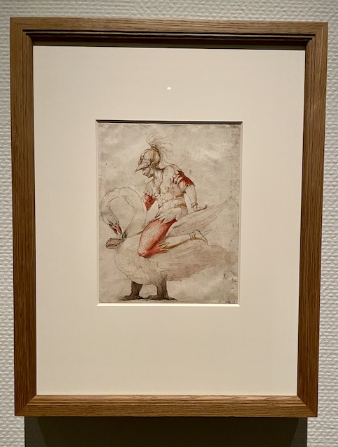 でも、思わず目が釘付けになる作品も! まず、ハチの目がとまったのは、第2章:フランスの《白鳥の騎士》。くるりと首を曲げた白鳥の背に甲冑姿の騎士がまたがっているのですが、白鳥の脚がっ……。宮廷で行われたページェントのコスチューム用デザインとのことなので、赤い脚は作り物。だったら、せめて腰の辺りに白鳥の胴体をもってきて、がっしりとした脚は全部出して、そこにほっそりとした白鳥の脚を描けばいいのに〜〜〜